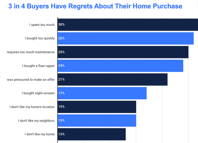 In the first staying-put camp, you have settled for a home you now regret purchasing. You bought during the pandemic home-buying competition under duress. 3/4 of Americans who purchased from 2020 to 2022 have regrets.